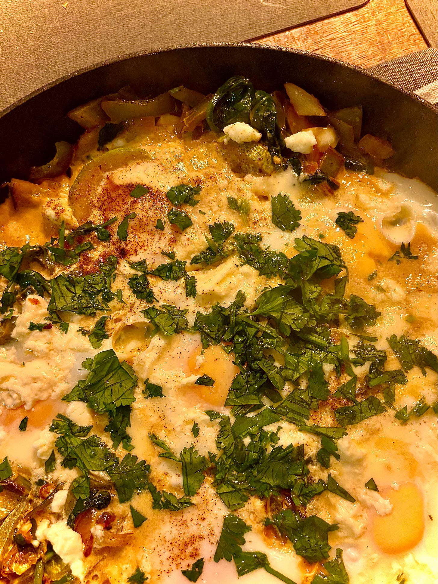 Instead of tomatoes, we’re leaning into green peppers, zucchini, onions, and leafy greens, all cooked down in one pan before nestling the eggs right into the mix. It’s finished with cheese, cilantro, lime, avocado, and hot red chiles — and yes, the toppings are non-negotiable.